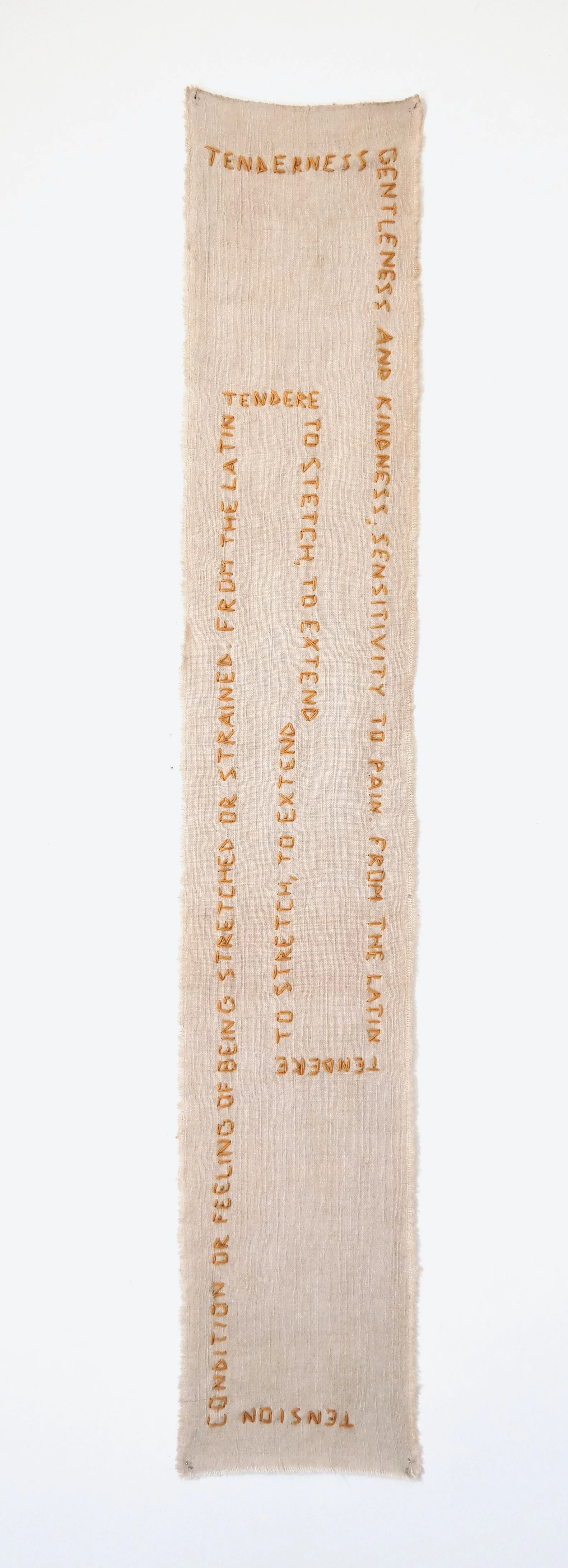 Both softness and the act of offering gentle attention, and something being pulled, stretched out, becoming taut, speak to reaching out beyond oneself, to an extension. In this piece, the words reach out to each other and meet in the center, at their root.
